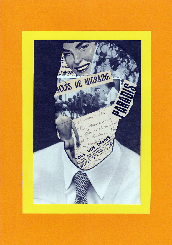 Gaston est un artiste qui réalise des collages dans lesquels des personnages, des visages, des objets habitants du passé (en particulier des années 50 et 60) retrouvent vie dans des compositions originales contemporaines, souriantes et décalées. Il recherche, compile, observe, imagine et découpe, froisse, déchire, … pour enfin combiner des fragments papier de toutes sortes, détourner, recomposer, réinventer et faire se télescoper les codes, les références et les temporalités. Le collage est un moyen d’expression qui fut utilisé par les mouvements cubiste, dadaïste et surréaliste, entre autres. Aujourd’hui encore, il s’impose comme une pratique artistique à part entière se libérant d’une description ressemblante de la réalité. Le collage crée de nouvelles formes et nous propose de nouvelles configurations visuelles et mentales. Gaston utilise la géométrie, la couleur, la typographie, les mots comme autant d’exclamations modernes qui replacent les sujets dans un temps suspendu. Comme un espace d’expérimentations, le collage lui permet une mise en scène à la fois ironique et sensible où s’immiscent coups de gueule et visions d’un monde contemporain souvent trop malmené. Gaston joue avec les mots, manie le scalpel avec dextérité pour confectionner des collages originaux, poétiques, farfelus et aux messages engagés. Avec ses créations complètement superflues donc absolument indispensables, Gaston traduit l’absurdité qui règne dans notre société pour remplacer, aisément et sans effet secondaire, la prise quotidienne d’antidépresseurs !