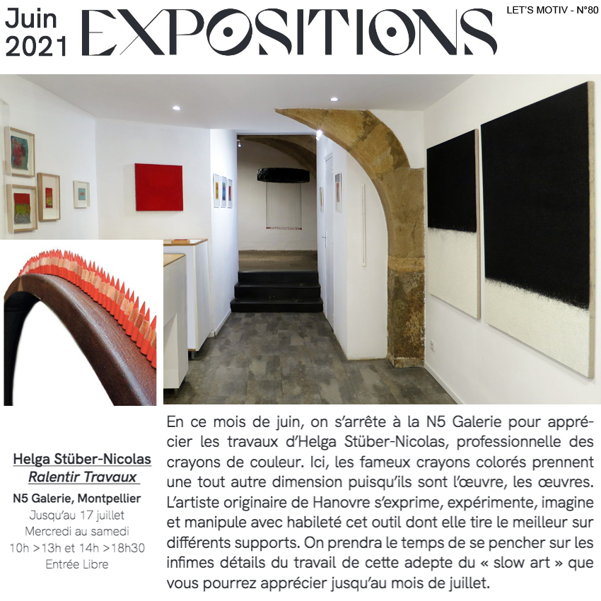 En entrant dans l’atelier d’Helga Stüber-Nicolas, nous sommes surpris par la senteur délicate du bois tout d’abord, puis notre regard est attiré par les couleurs qui inondent l’espace. Cet atelier est en effet « envahi » de crayons, rangés avec minutie sur des étagères, dans des tiroirs, savamment classifiés, répertoriés dans des boites. Mais ce ne sont pas n’importe quels crayons ! Ce sont des crayons hauts de gamme, en bois, avec des mines composées de pigments de qualité, que l’artiste considère avec préciosité … et qu’elle manipule avec une dextérité chirurgicale. Bien sûr le crayon lui sert à s’exprimer, mais d’une façon évidemment différente de ce que nous pourrions imaginer, car elle le détourne de sa fonction initiale. La mine est séparée de son bois par le taille-crayon puis l’artiste explore les potentialités de ces deux matériaux que rien ne prédestinait à la fragilité, à la légèreté, à l’abstraction. C’est dans la lente déconstruction du crayon que la création se fait. La notion du temps est en effet essentielle pour Helga Stüber- Nicolas, la minutie de son travail « slow art » étant à contrecourant du temps social, du zapping. L’artiste joue avec les codes de la peinture, d’une part par les nuances multiples de la couleur qu’elle extrait des mines de crayons et d’autre part par ses compositions « abstraites » et géométriques qu’elle crée en disposant sur sa toile les poussières de mines colorées. Ainsi, le crayon qui est usuellement destiné à s’effacer devient ici l’élément essentiel, constitutif de l’œuvre d’Helga Stüber-Nicolas, à travers sa matérialité et non plus sa fonction. Ce crayon n’est plus à percevoir comme un outil, mais comme l’œuvre elle-même…