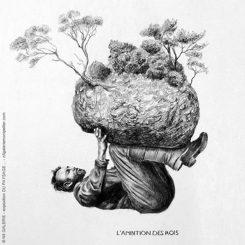 Scientifique de carrière et désormais artiste plasticien, Dominique Nicolas pratique l’art du collage par l’association insolite, souvent drôle et toujours poétique de plusieurs réalités. Dans la série des œuvres présentées ici, l’artiste s’est concentré sur l’un des éléments vivants les plus marquant d’un paysage : l’arbre. Outre les considérations écologiques, économiques, esthétiques que nous pouvons lui prêter, il est souvent un repère, nous permettant de nous orienter. Son ancrage dans un lieu nous procure sérénité et rassurance vis-à-vis des adaptations à vivre dans un environnement en perpétuel mouvement. Grâce à ses scalpels aiguisés, l’artiste découpe méticuleusement ces arbres dans un ouvrage recueil de dessins (de deux créateurs paysagistes italiens, Césaré Leonardi et Franca Stasi) destiné à servir de modèles pour visualiser le devenir de parcs paysagés depuis leur plantation jusqu’à différents âges. Puis il entreprend un minutieux et surprenant assemblage instaurant une communion confidentielle entre l’humain et le végétal. Ici un banc ou une chaise symbolise l’intimité, là un engin de chantier viendrait rompre l’harmonie entre ces deux êtres vivants. Cet arbre, isolé de son environnement éveille le visiteur à une perception nouvelle faisant appel à ses propres ressentis. Entre une réflexion sur les interactions art-science et une anthropologie des relations de l’homme à la nature, cette série de collages ne laissera personne indifférent.